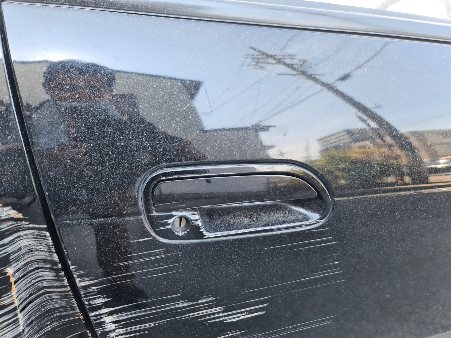 左側面をぶつけられたエルグランド。 こいつの難点は純正のくせに、マジョーラカラーが塗装してある特別色なのです。