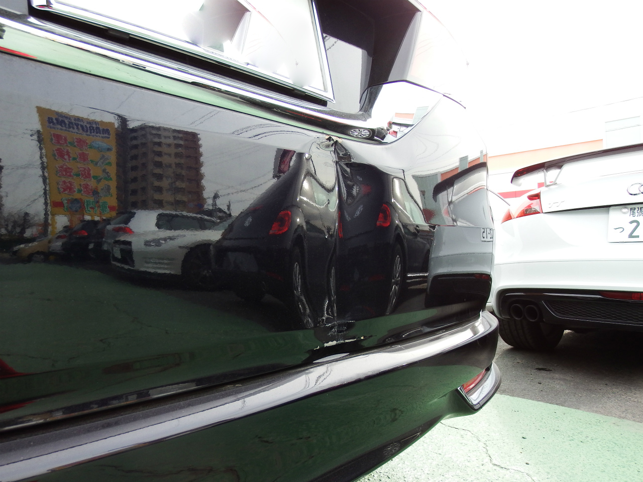 リアゲート板金塗装、リアバンパー補修塗装。透明なガーニッシュは交換。
