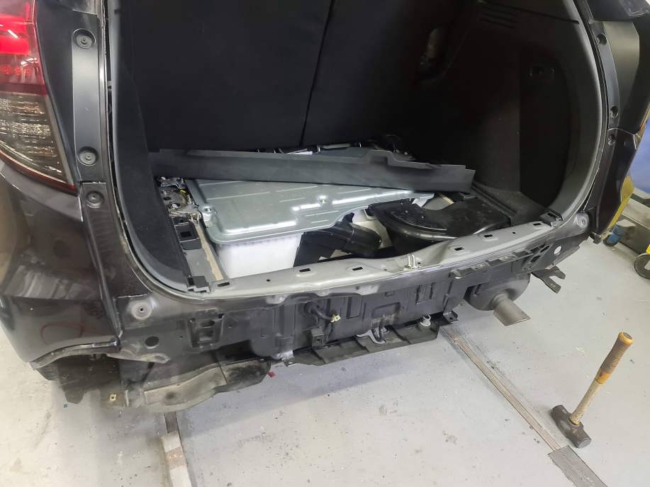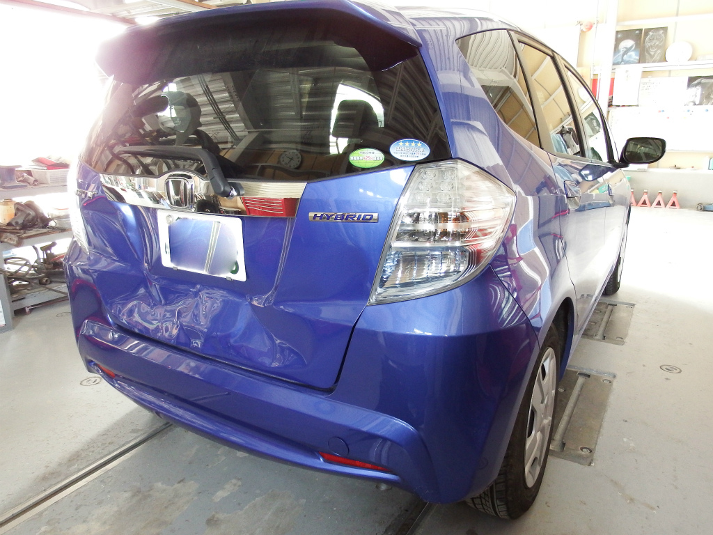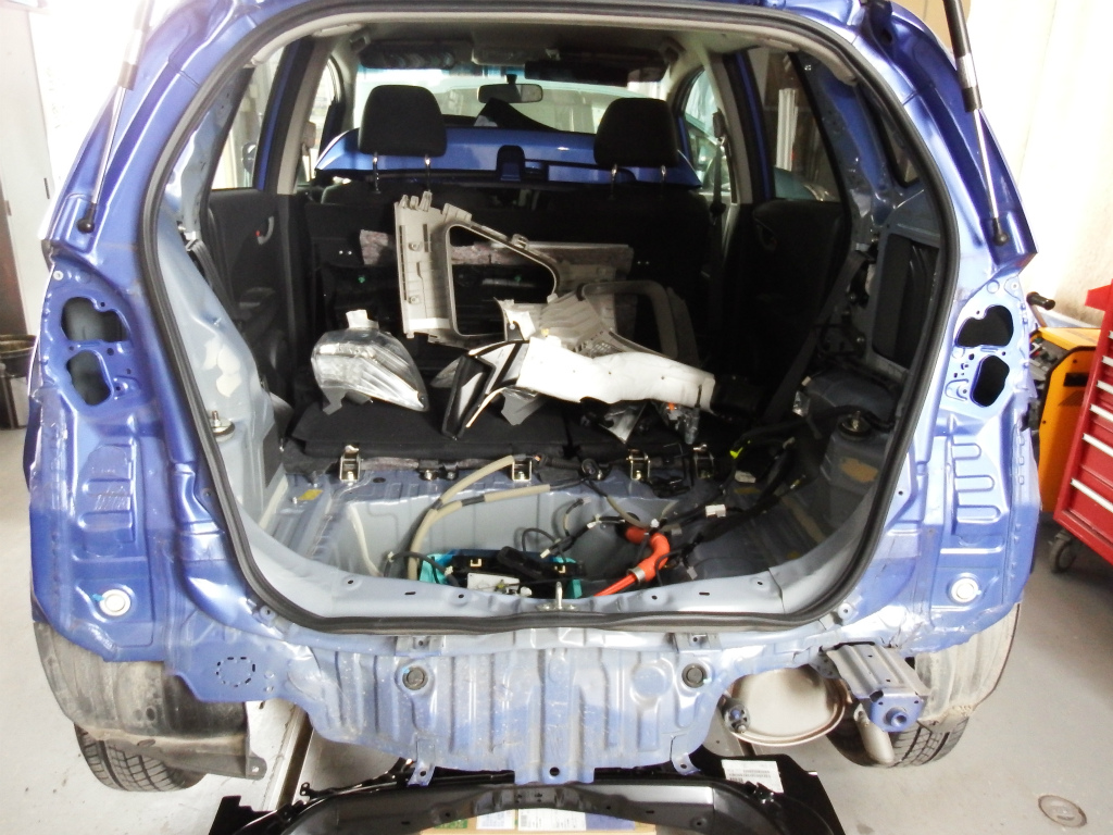 リヤを追突されました、フィット。 ハイブリット車なので、低電圧の資格がないと触ってはいけません