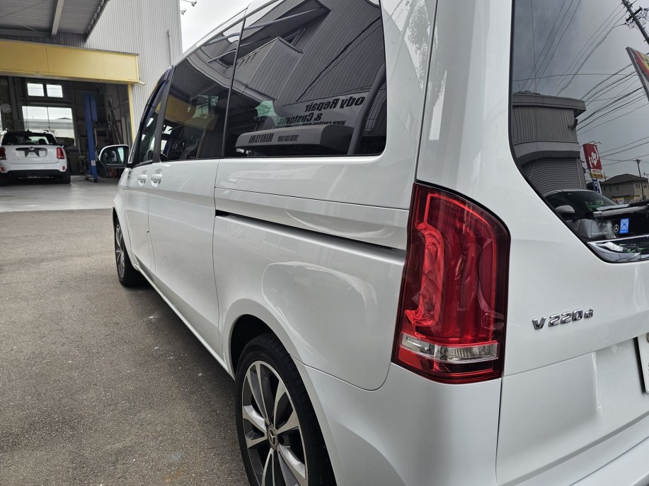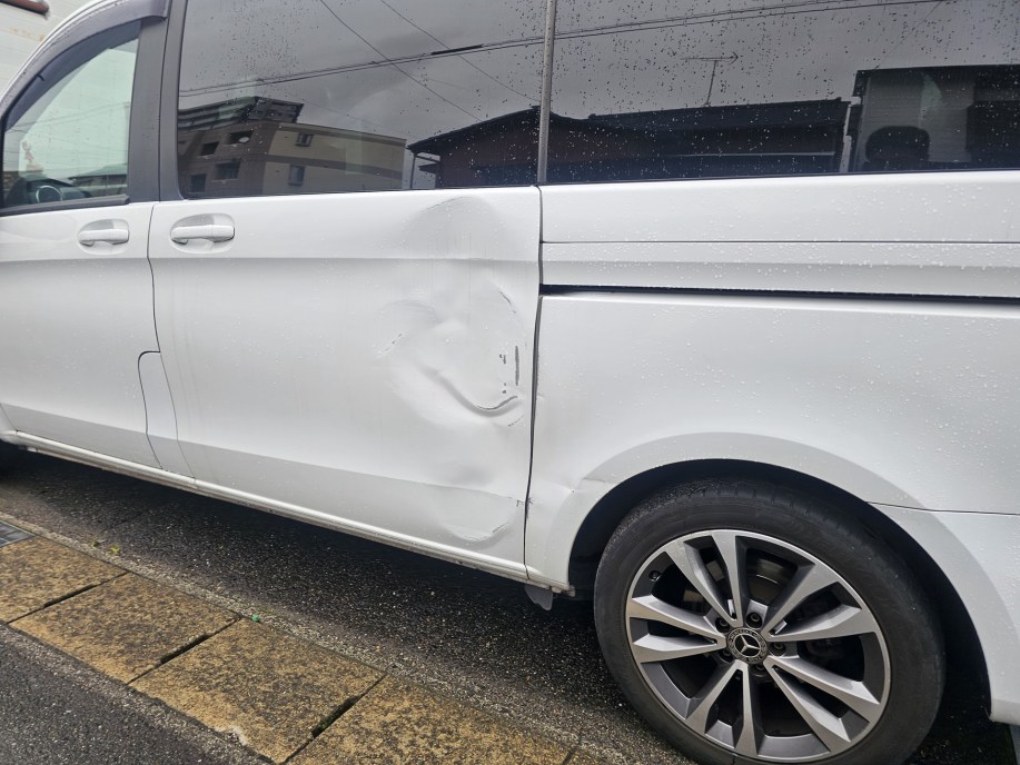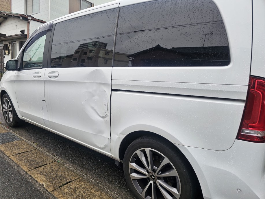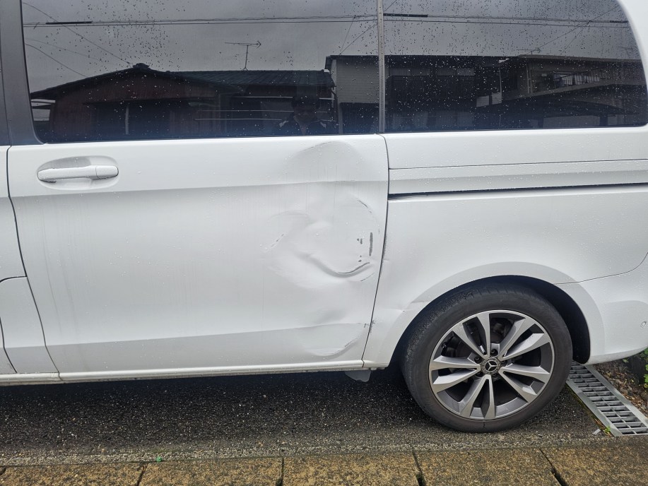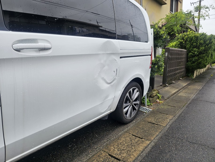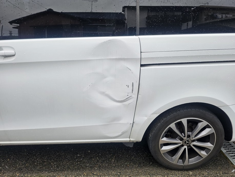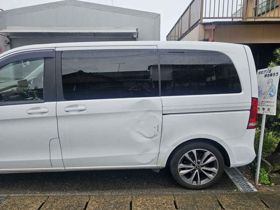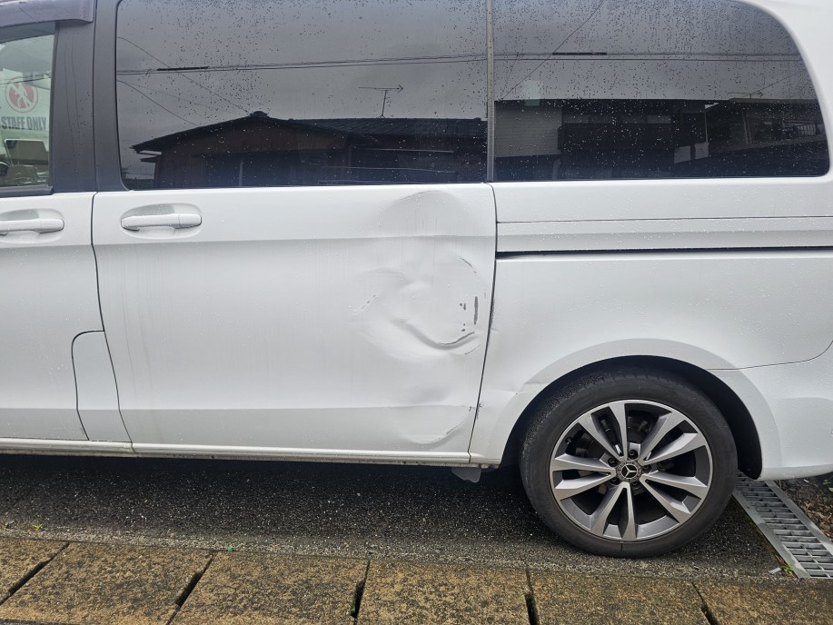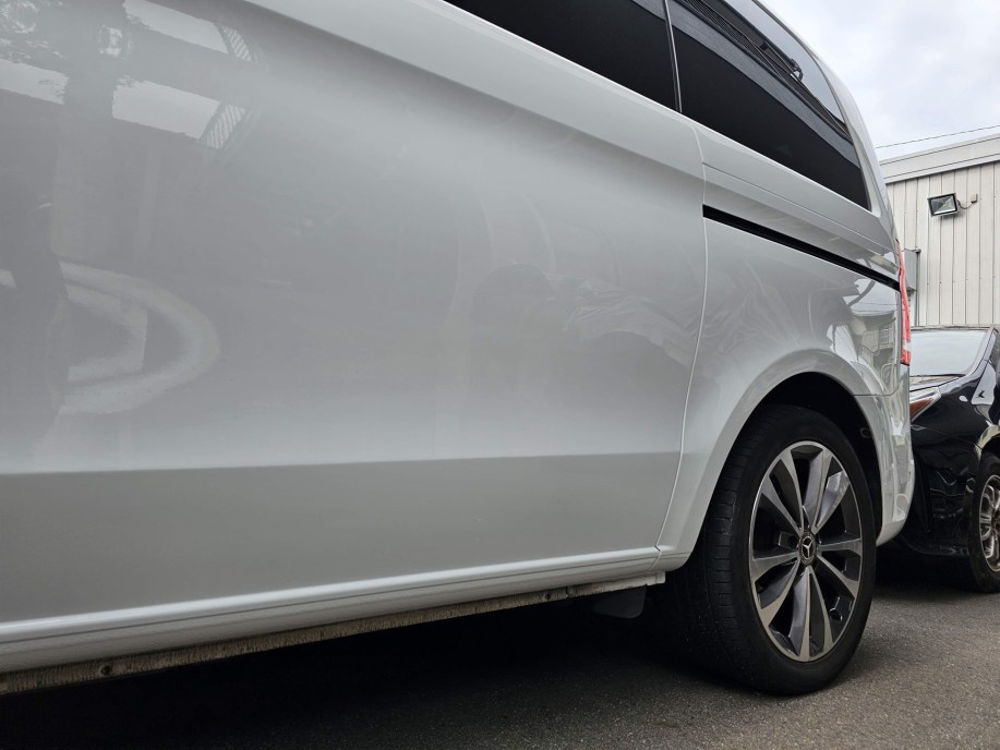 新しい香りのする新車ベンツAクラスの入庫です。右側面リアを、がっつり巻き込んでいます。
