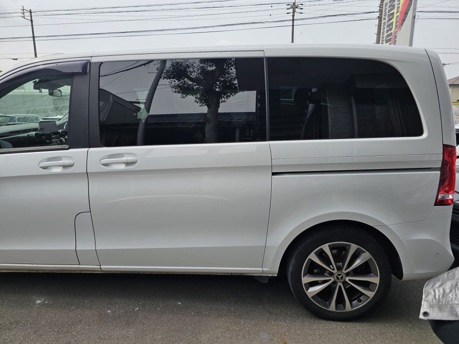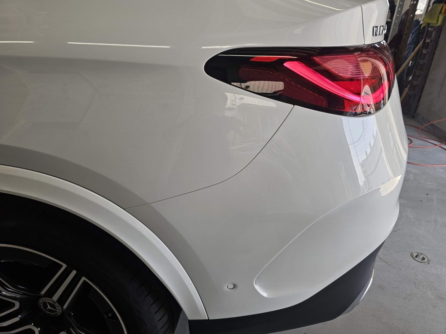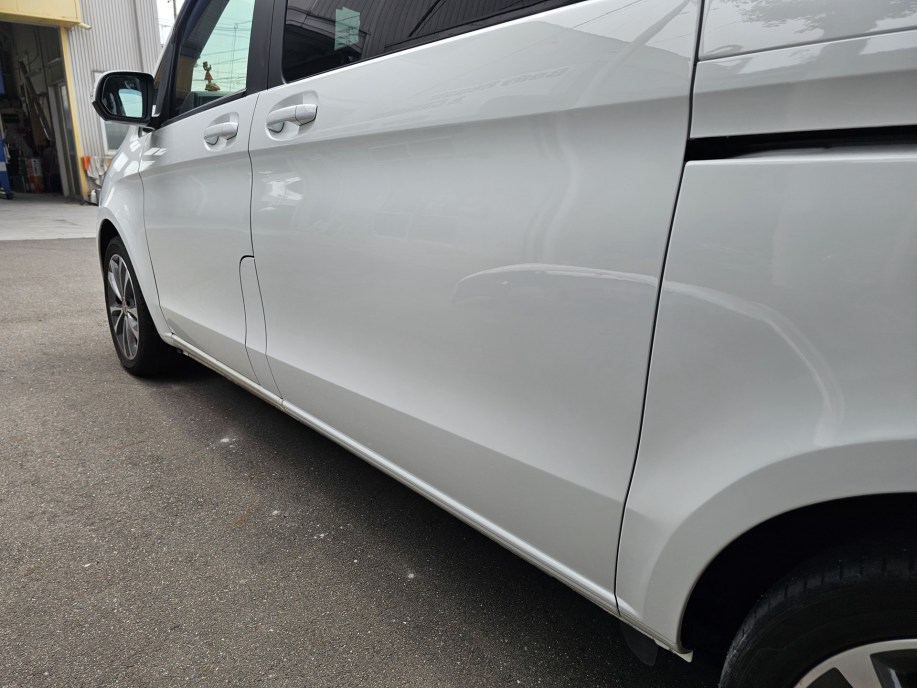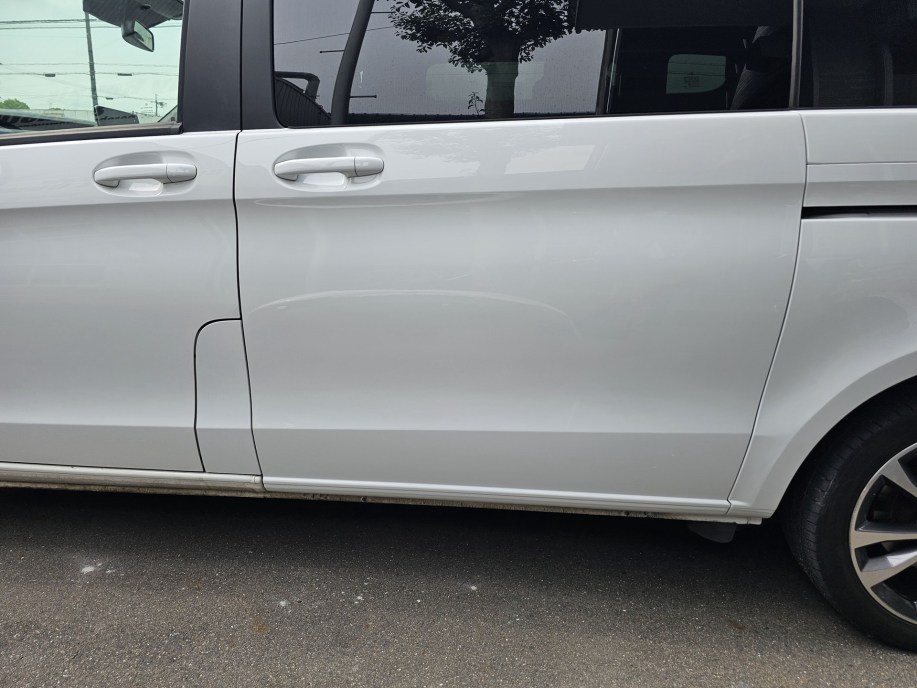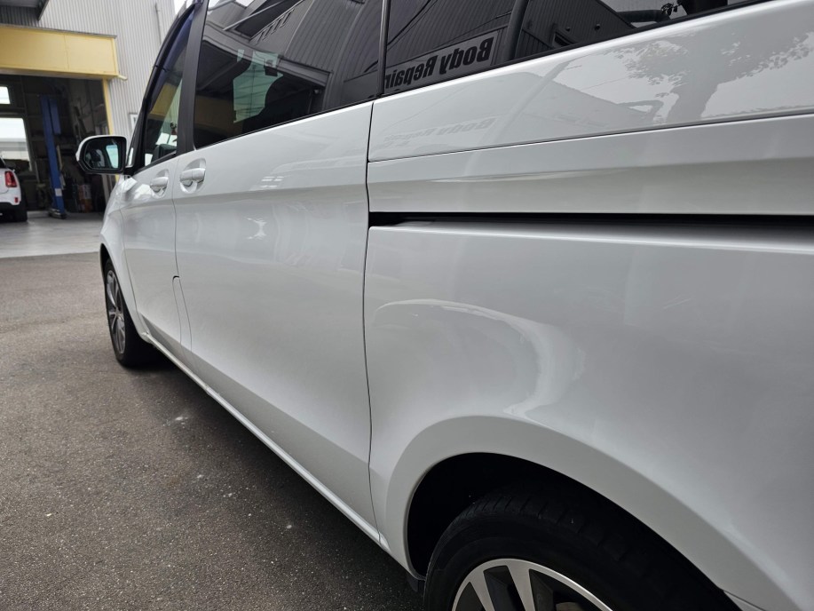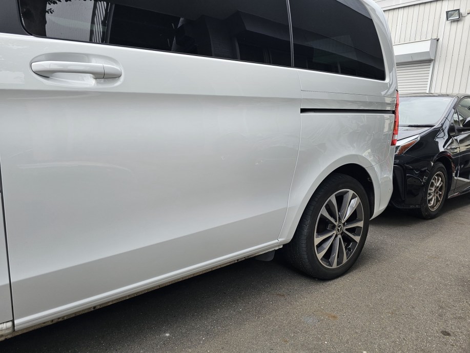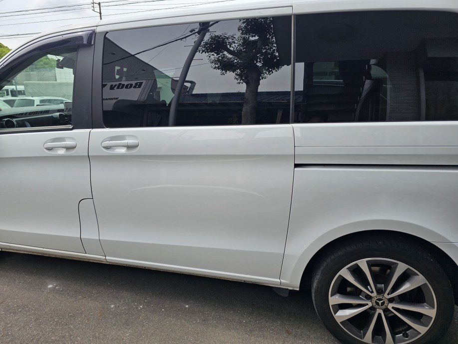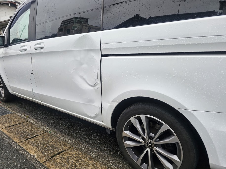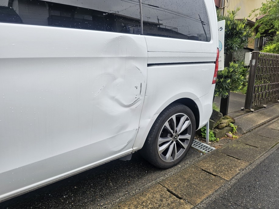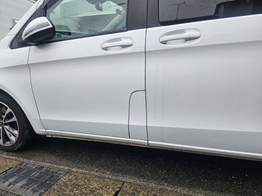 新しい香りのする新車ベンツAクラスの入庫です。右側面リアを、がっつり巻き込んでいます。