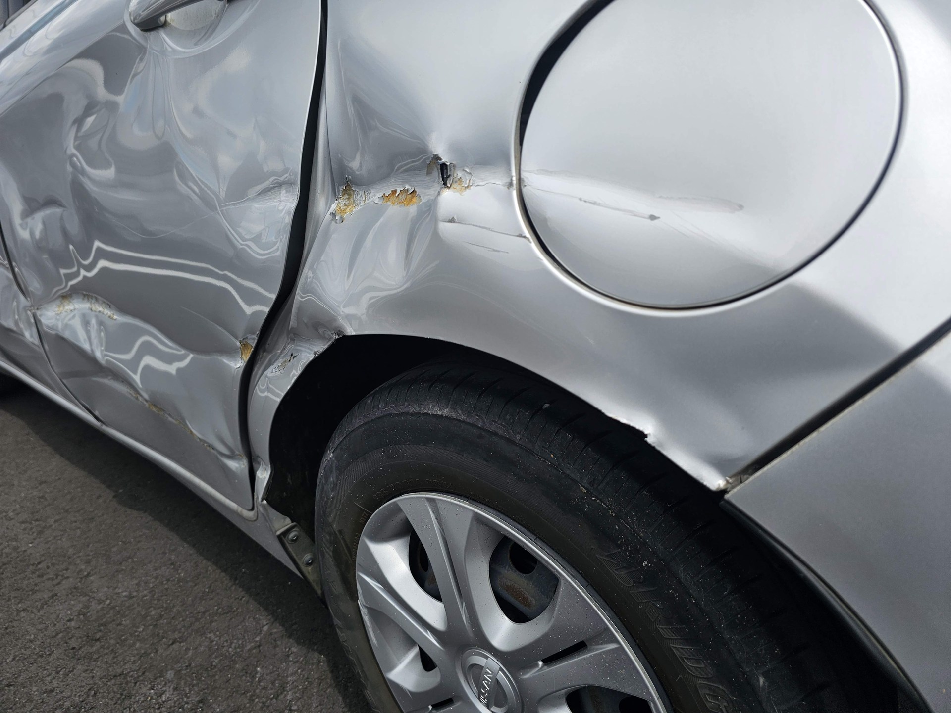 左側面をガードレールに突き刺してしまったようです。 身動きが取れず、無理やり動いてしまった結果です。