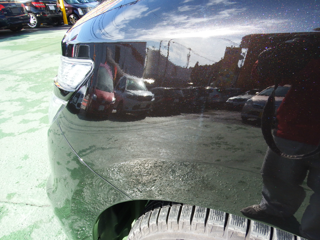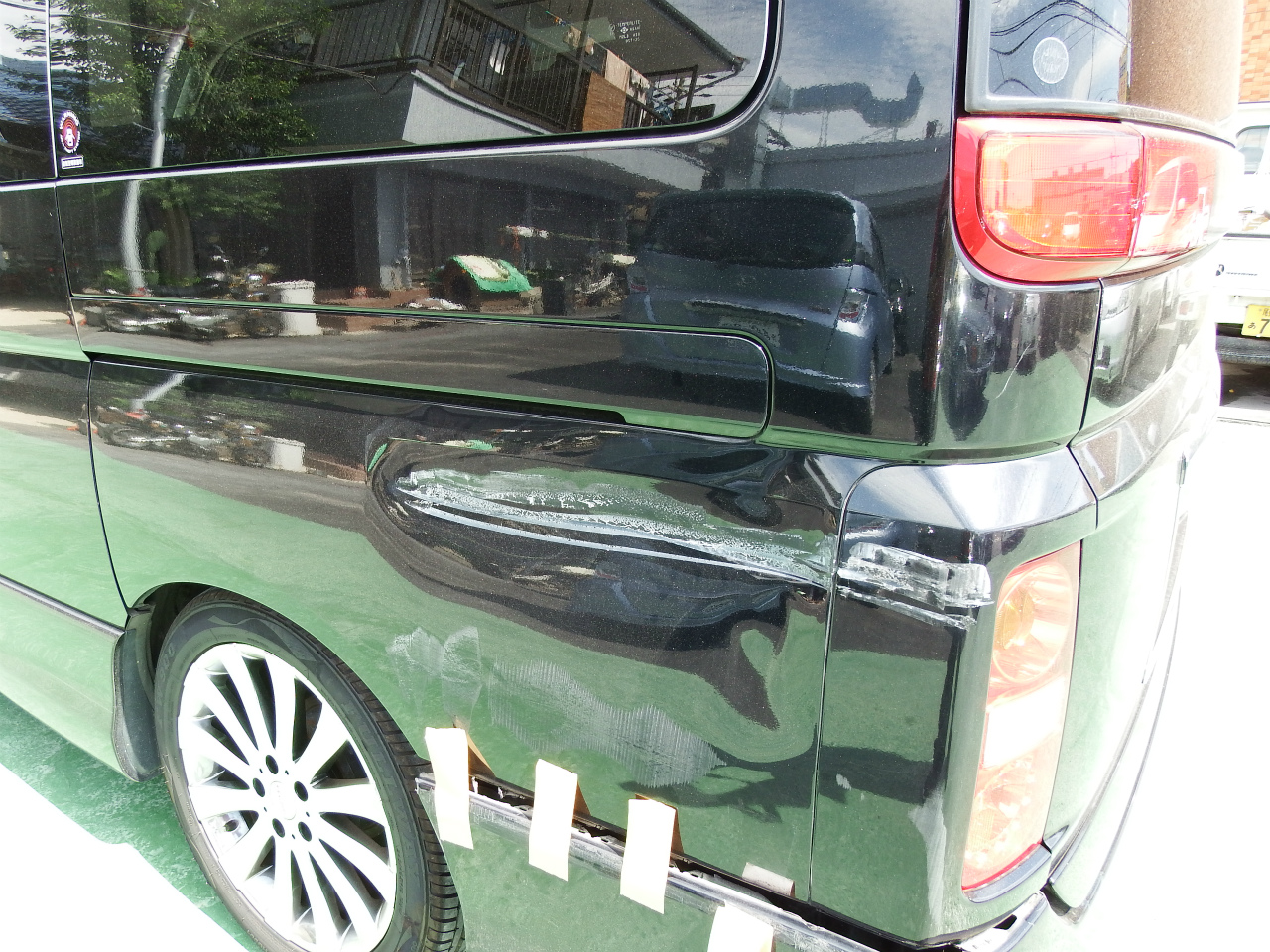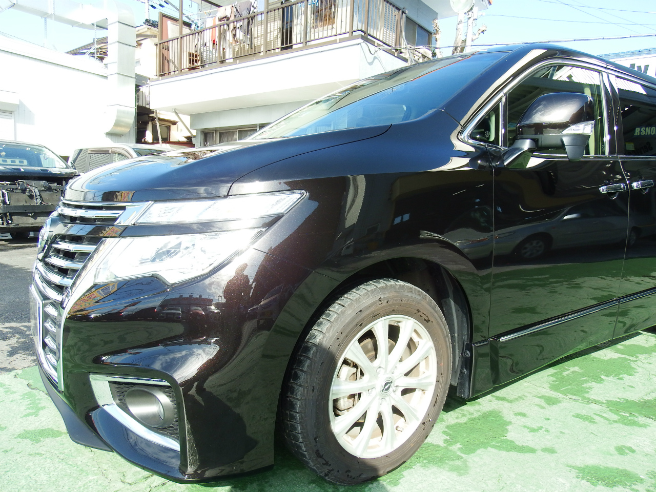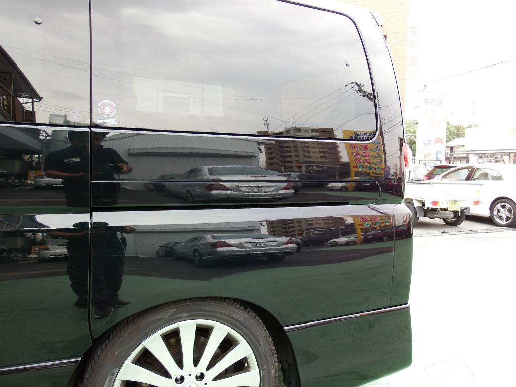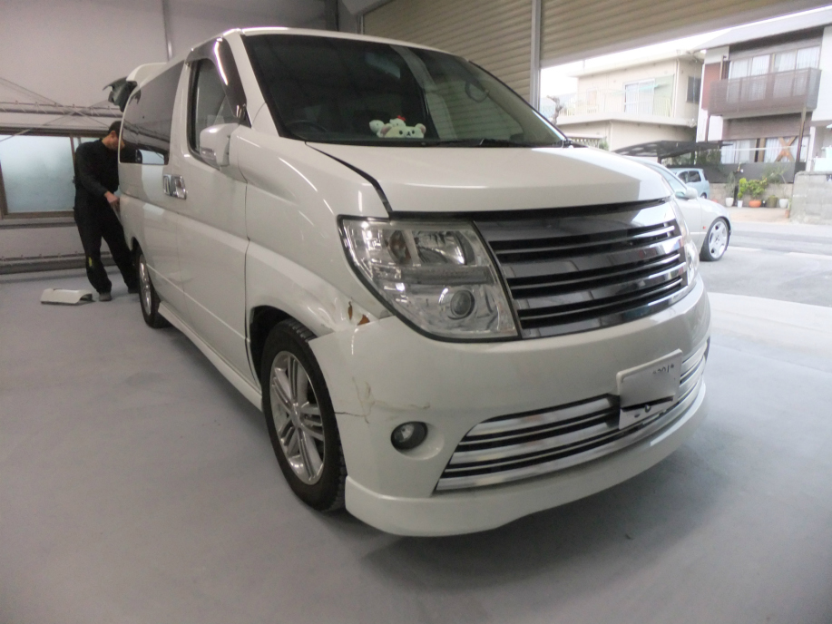 左側面をぶつけられたエルグランド。 こいつの難点は純正のくせに、マジョーラカラーが塗装してある特別色なのです。