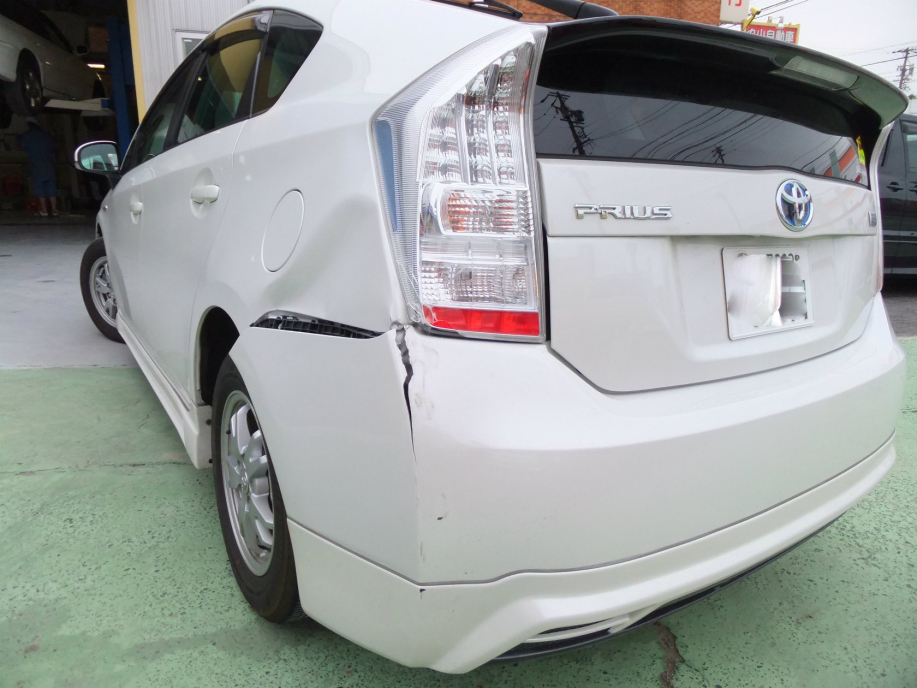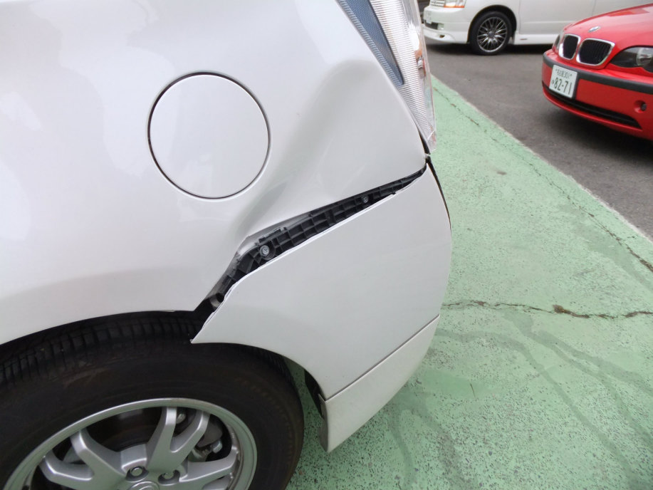 バックした時に、柱のようなものに激突。リアバンパーのカバーごと、ボディが押されてしまい、クォータに