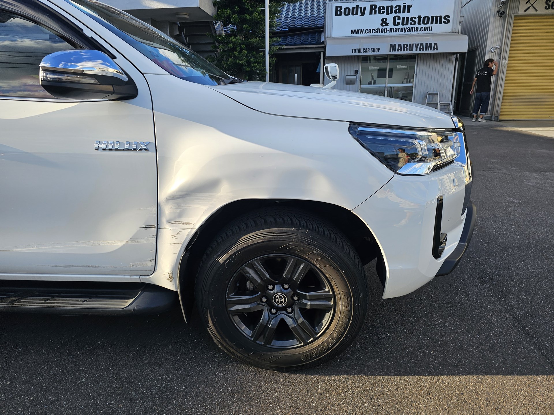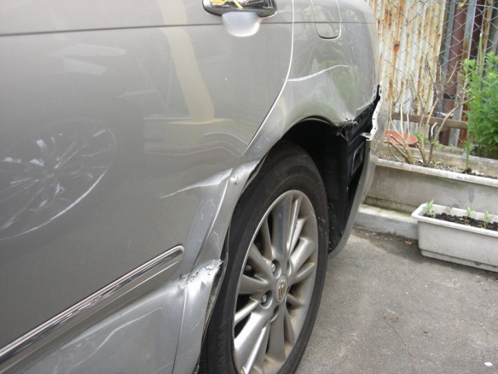 左側面事故。 えぐれて切れています。ひどいですねぇ。