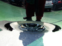 運転席から見えづらい、支柱にぶつかってしまったようです。下から覗き込むと、かなり、おされてしまっています。