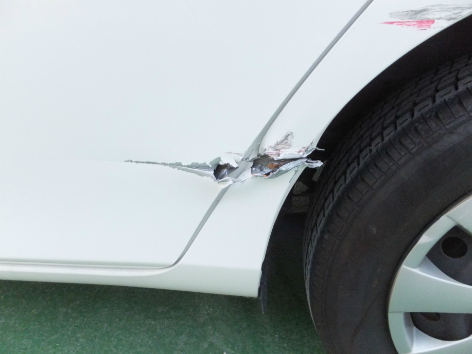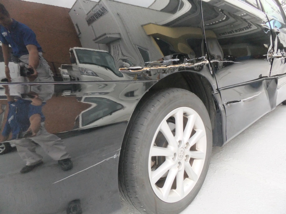 左側面、べっこりです。お客様は、一瞬、車を買い替えようかと、思われたそうです。