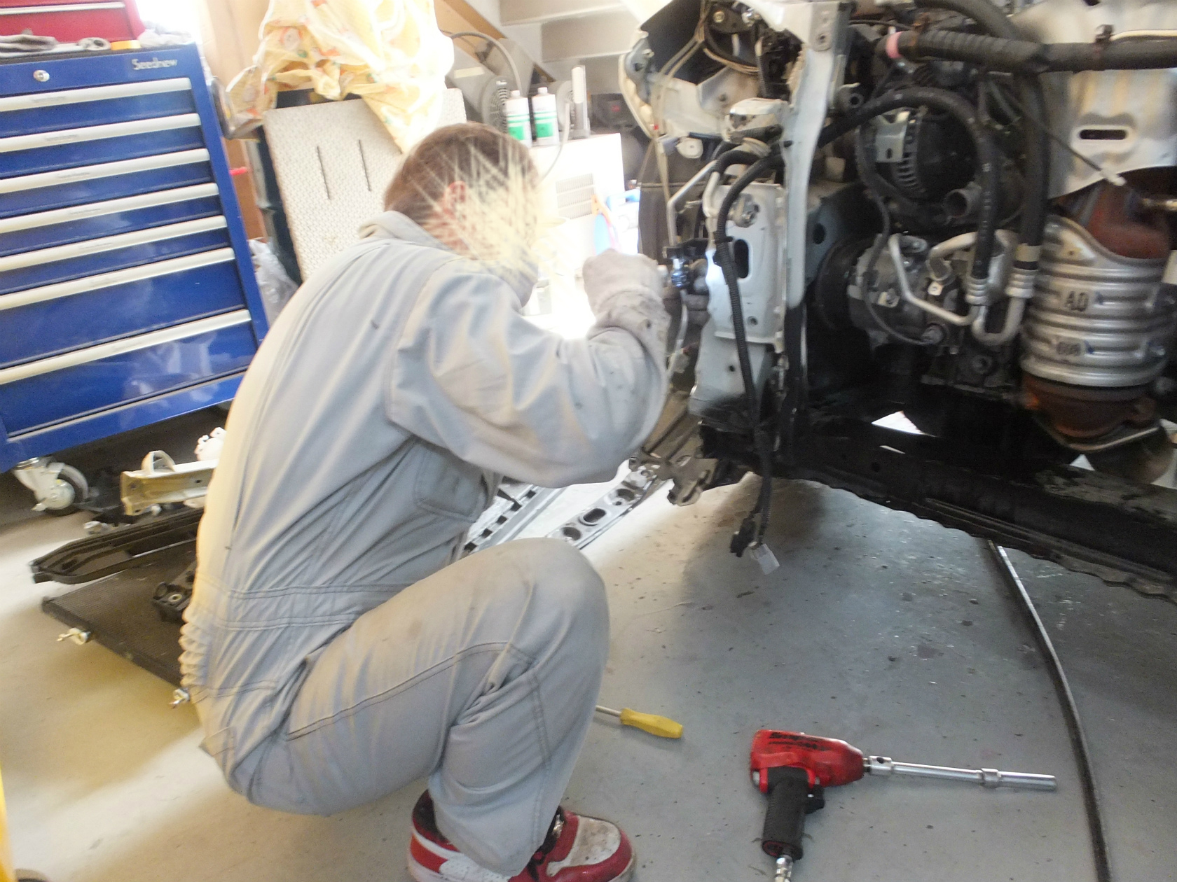 さぁ、いよいよ、板金の開始です。邪魔な部品を取ったり、切ってはがしたり、ちょっとずつ修正しながら分解します。