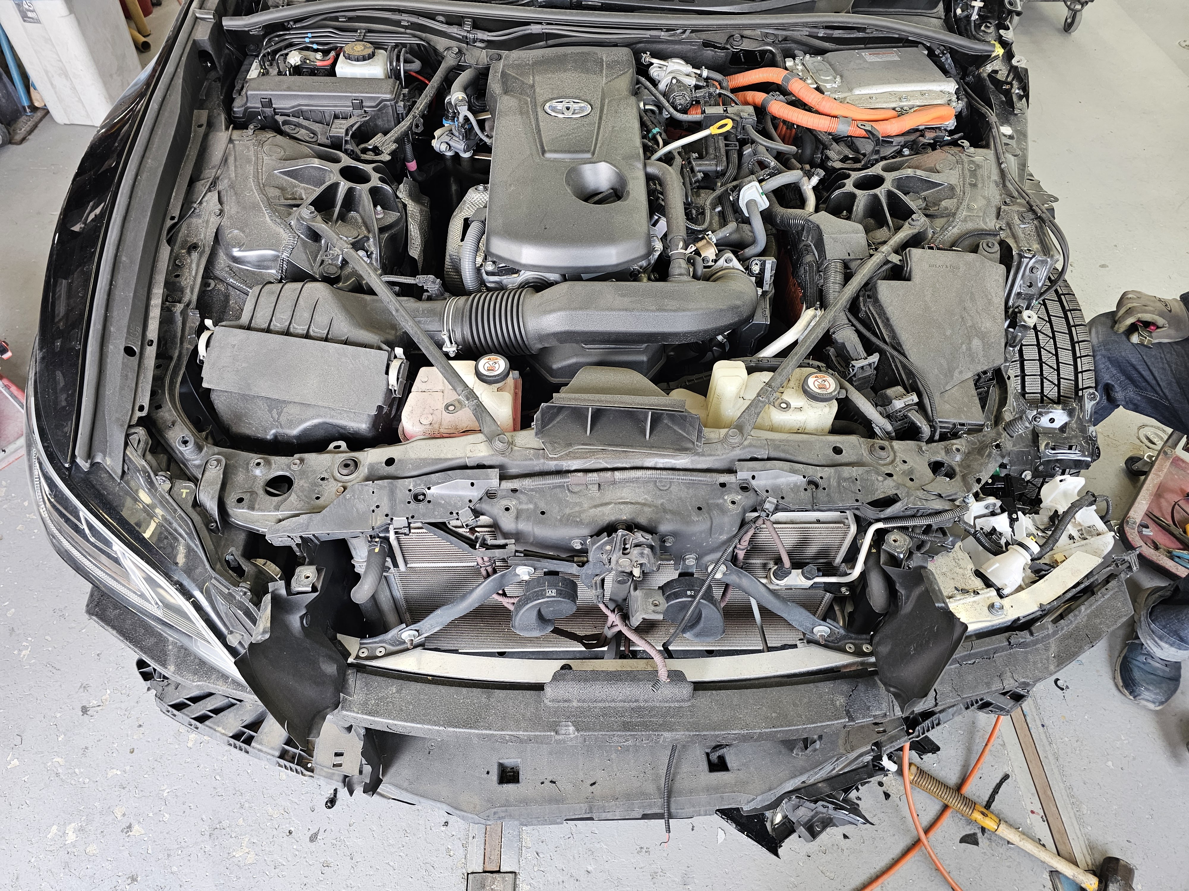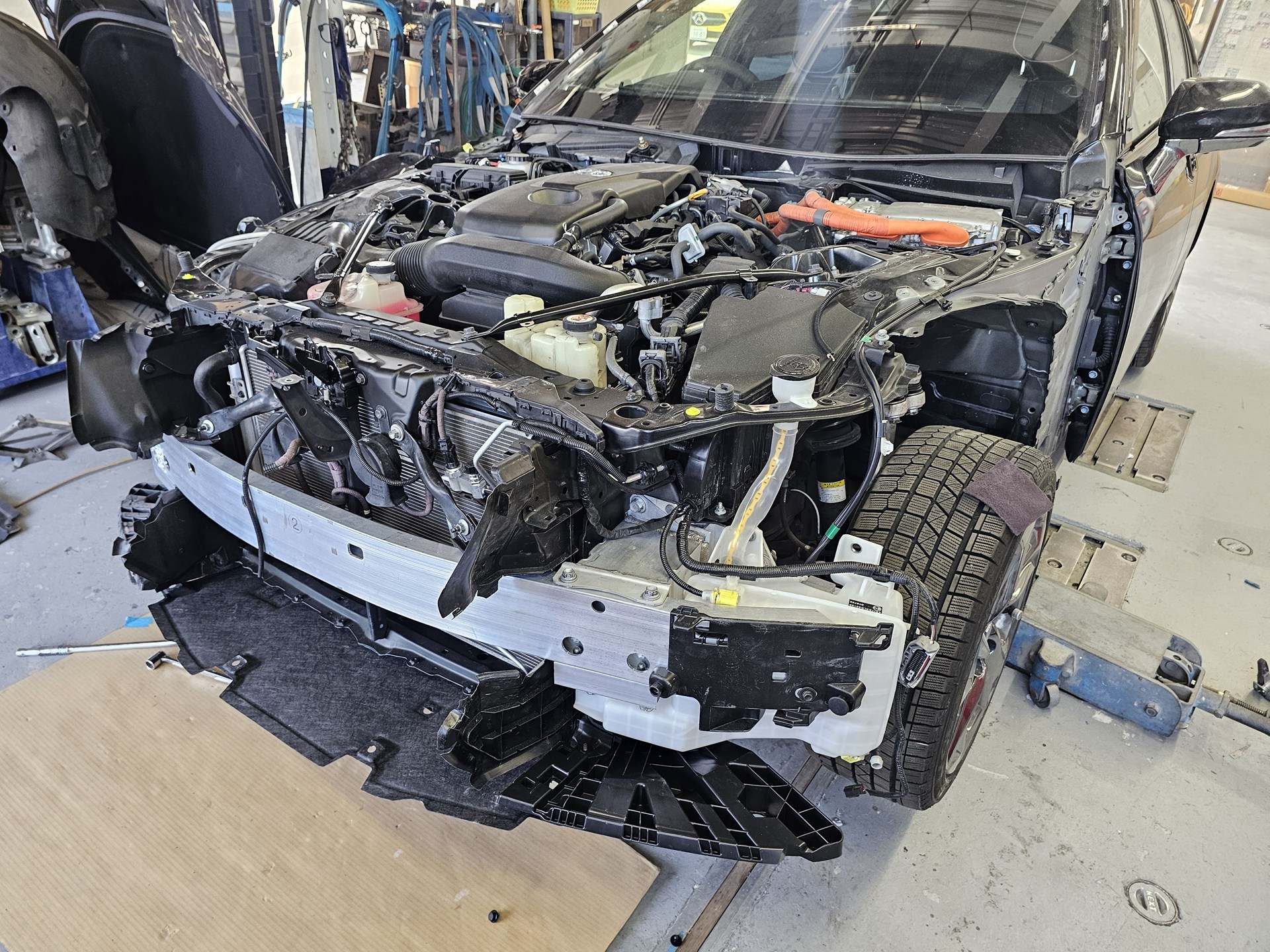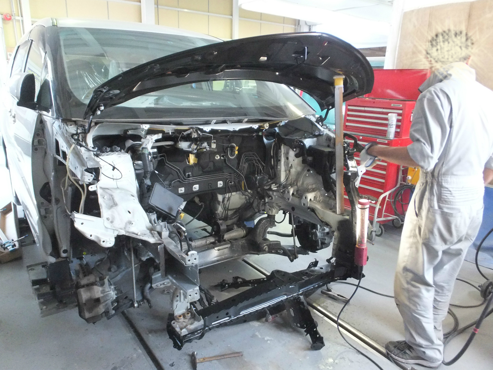 | エスティマ 前方出会い頭事故 エンジン下ろしてフレーム板金 |