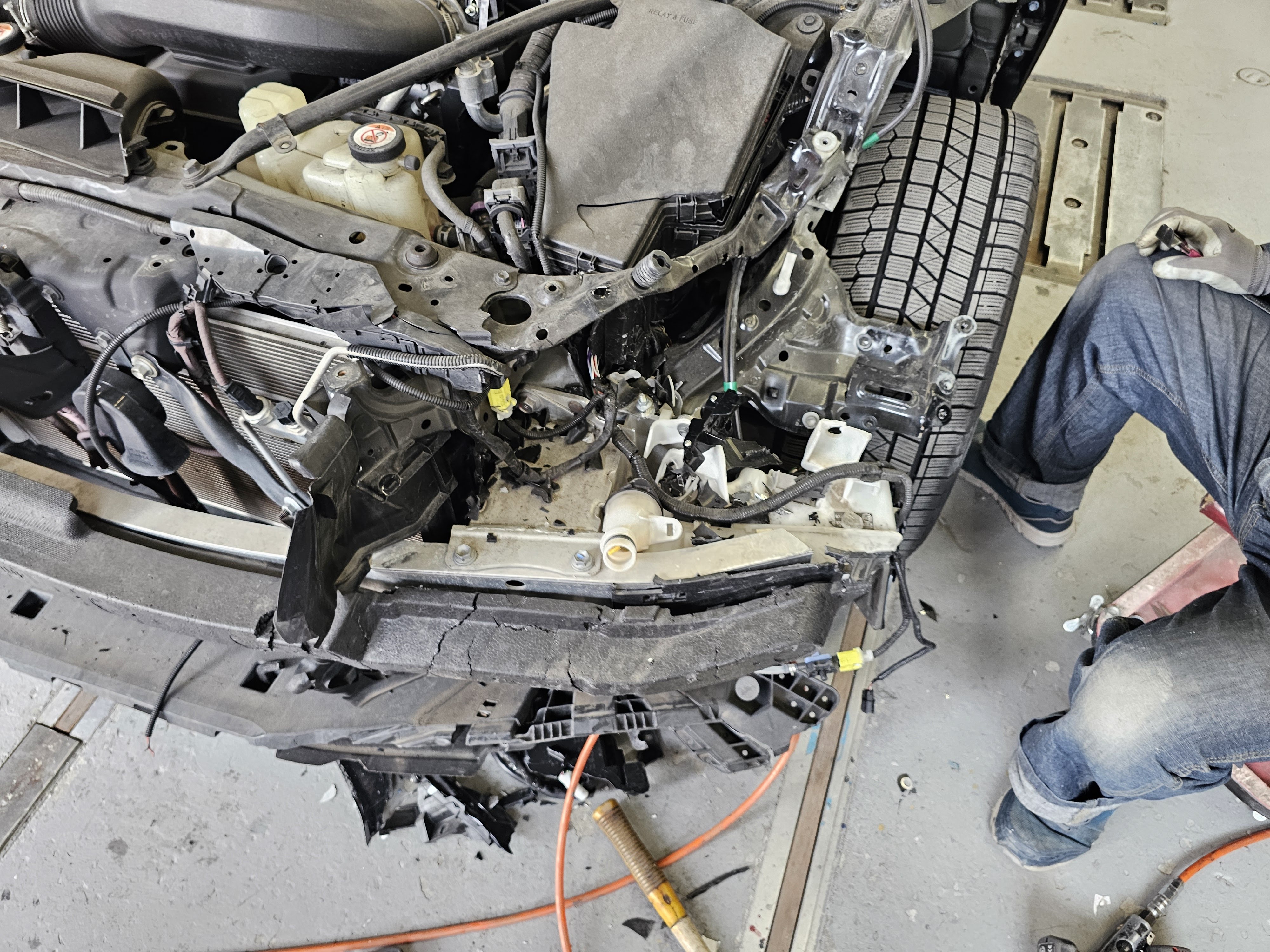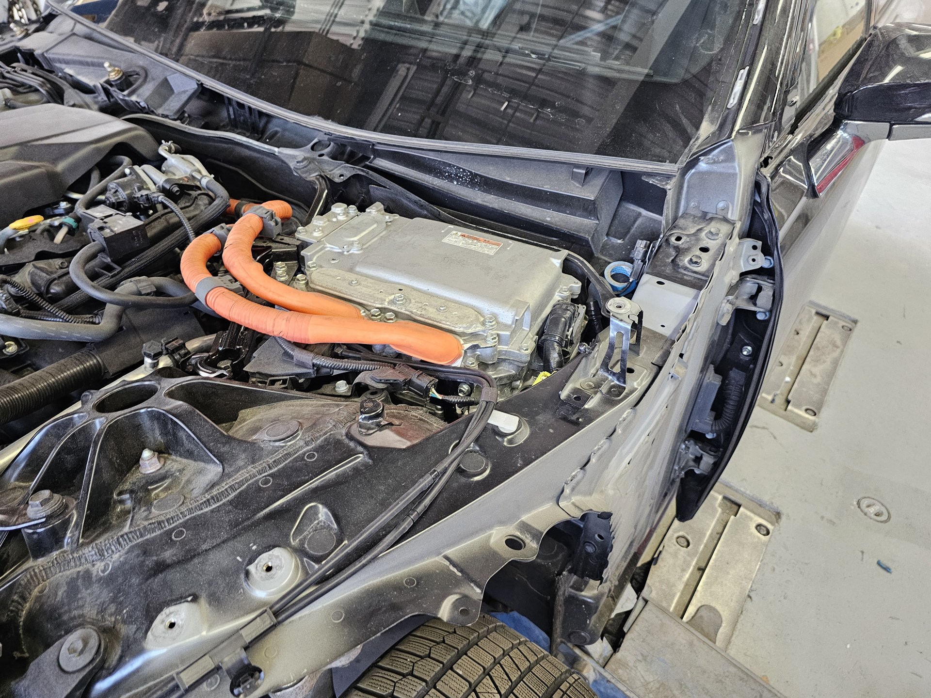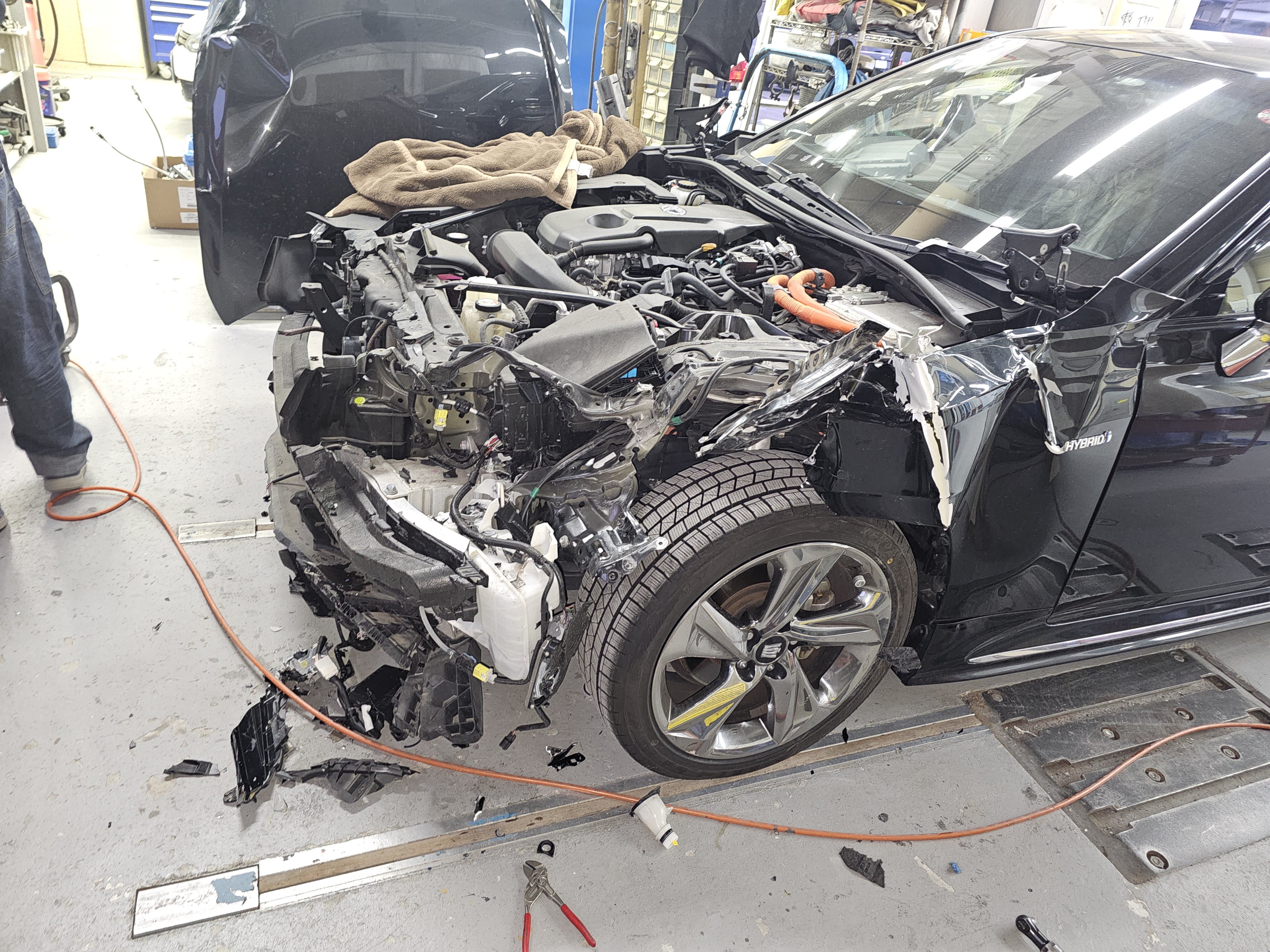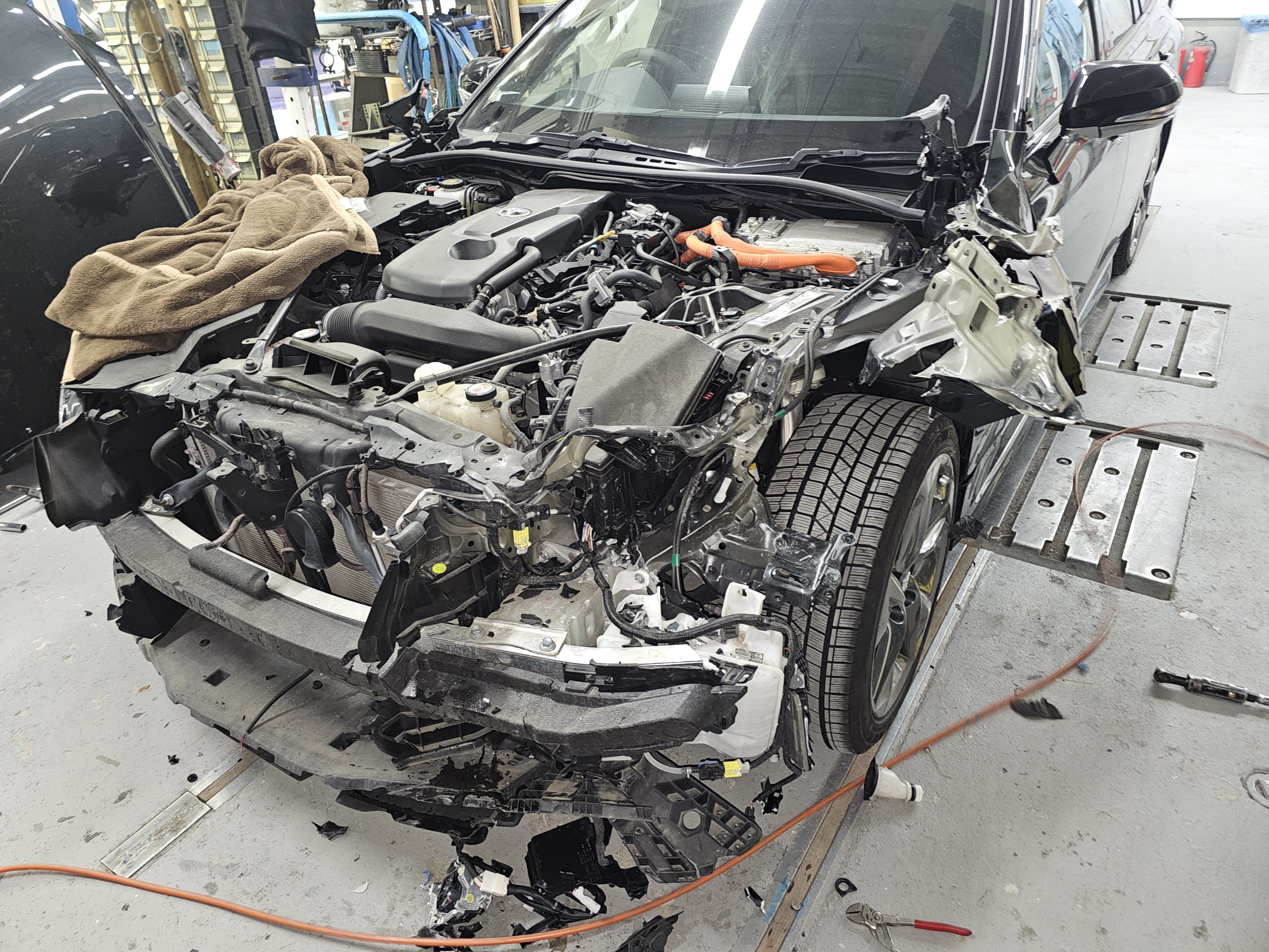 | エスティマ 前方出会い頭事故 エンジン下ろしてフレーム板金 |