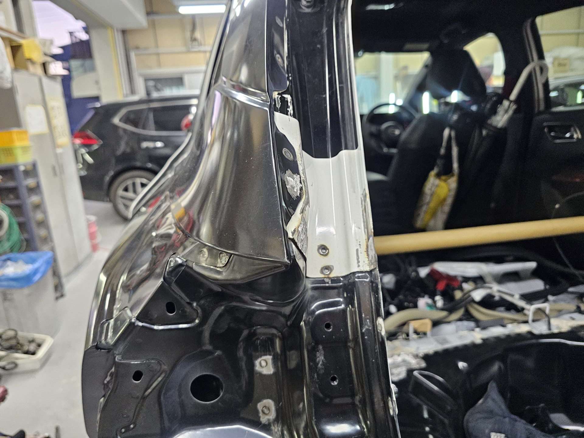 インナーのセンターピラー<柱> 付近も、所々、ダメージが有ります。